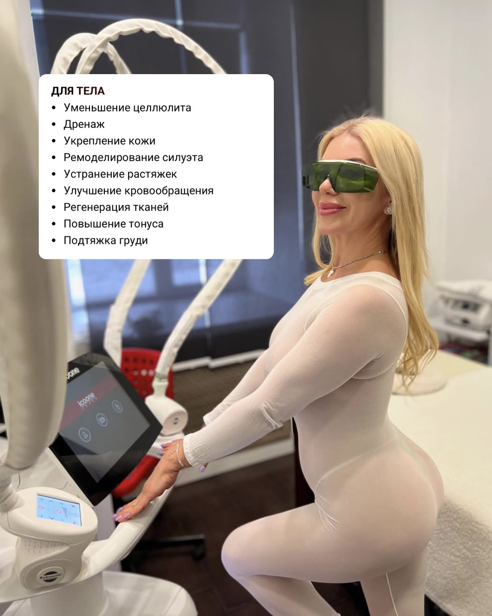 ICOONE — это умный подход к коррекции фигуры: он точечно убирает жир в проблемных зонах — животе, «ушках» и боках — не трогая рельеф рук, спины и ягодиц.